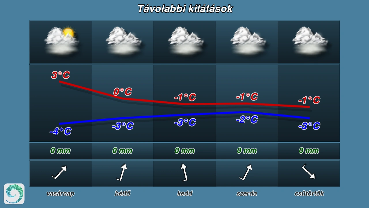 Napközben változóan felhős lesz az ég, többórás napsütés várható. Csapadék nem lesz. Az északnyugati, majd az északira forduló szél gyenge vagy mérsékelt marad. A legmagasabb nappali hőmérséklet 2, 7 fok között alakul.