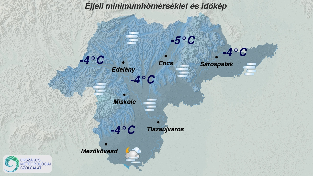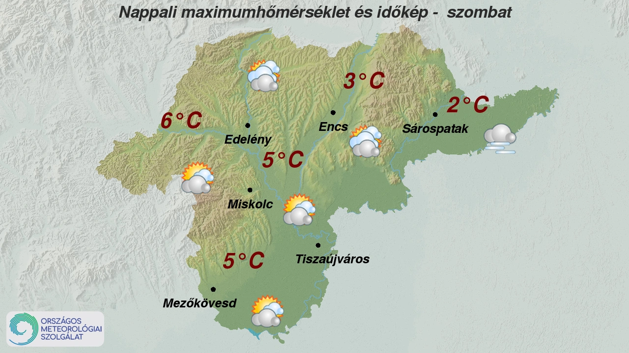 Szombaton hajnalban párás, ködös idő várható csapadék nélkül. A változó irányú szél gyenge vagy mérsékelt marad. A legalacsonyabb éjszakai hőmérséklet -5, -1 fok között alakul.