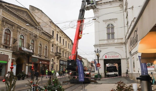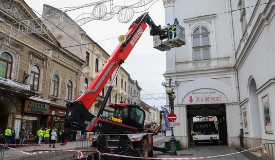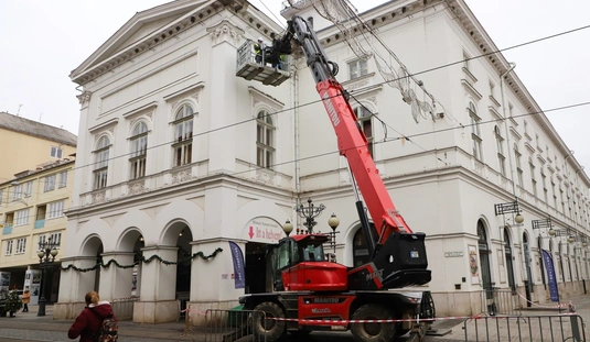 Veszélytelenítési munkálatok a Nagyszínház homlokzatán