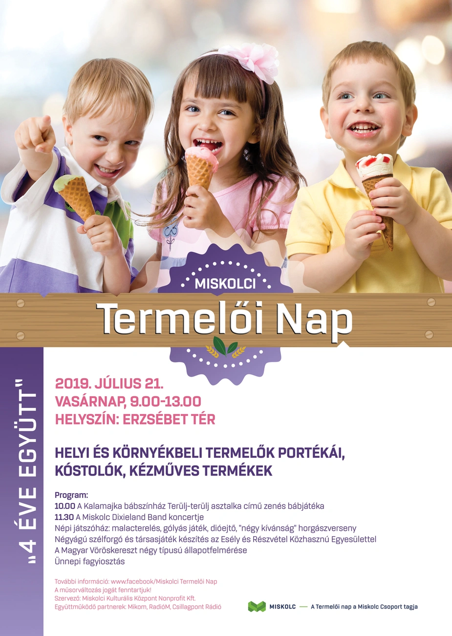Négy éve színesíti városunk közéletét a Miskolci Termelői Nap, ami július 21-én ünnepi hangulatban várja az érdeklődőket. A közkedvelt helyi termelők finomságai mellett a Miskolc Dixieland Band koncertje, bábszínház, gyermekprogramok és születésnapi fagyiosztás miatt is érdemes lesz kilátogatni az Erzsébet térre.