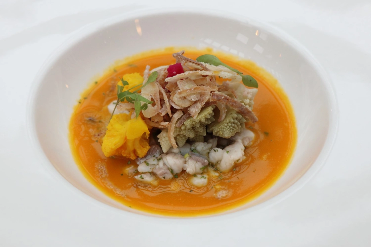 – Alapvetően úgy készül, mint az általunk ismert halászlé. Annyi variációval, hogy a hagyma és paradicsom mellé édesköményt vágunk össze, és az egészet sáfránnyal ízesítjük, attól lesz ilyen sárgás színű, majd kókusztejjel összefőzzük – részletezte Boros Marcell konyhafőnök-helyettes. Az eredetibe kagylót és rákot is szoktak tenni. – Mi a fűszerezését hozzuk, de a tengeri halakat és a kagylókat kihagytuk belőle, helyette a hazai édesvízi halakat preferáljuk. Ebből készül az alaplé is és a betét is.