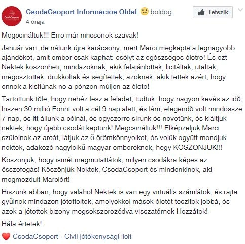 Szerencsére a pénz összegyűlt, így minden esély megvan arra, hogy hamarosan a kisfiú felépüléséről is beszámolhassunk.