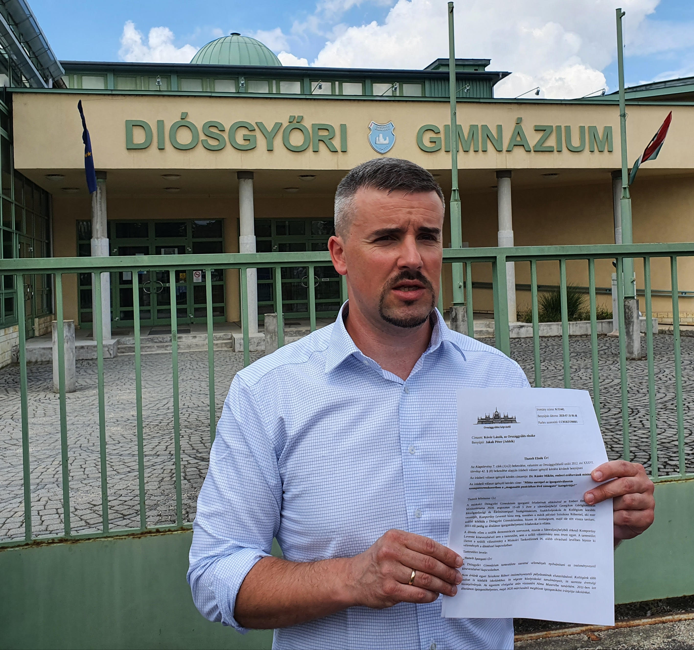 A szakminisztériumhoz, azaz, az Emberi Erőforrások Minisztériumához fordul Jakab Péter, a Jobbik elnöke a Diósgyőri Gimnázium új igazgatójának kinevezése miatt.