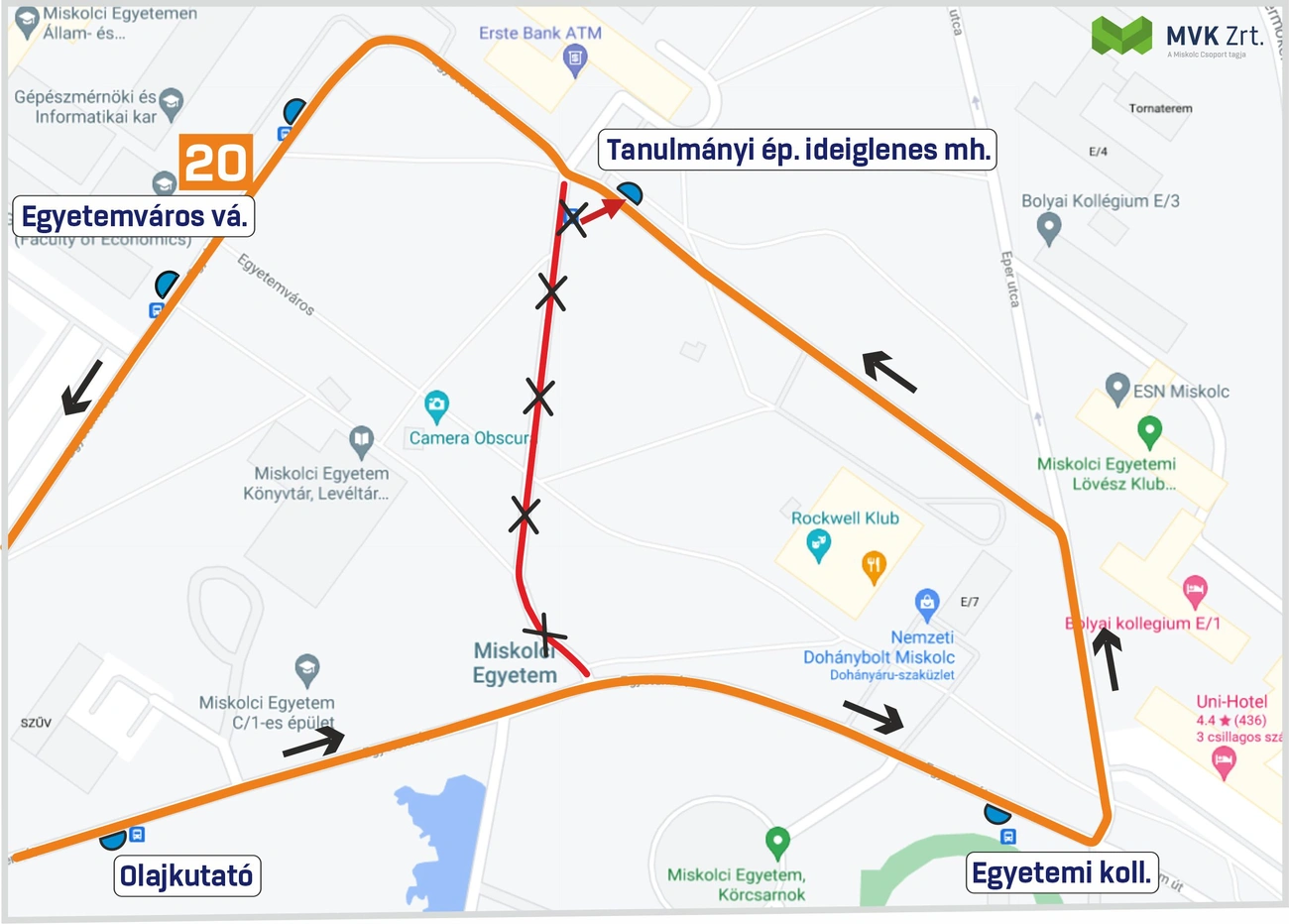 Az Olajkutató megállóhely után a Repülőtér/Bosch végállomás irányába közlekedő 20-as autóbuszok nem fordulnak be a Tanulmányi épület megállóhelyhez vezető útra, hanem továbbközlekednek és az Uni-Hotel előtti útra kanyarodnak be balra, majd az első keresztutcába ismét balra fordulnak, itt kerül kialakításra az ideiglenesen megállóhely (térképet mellékeltünk).