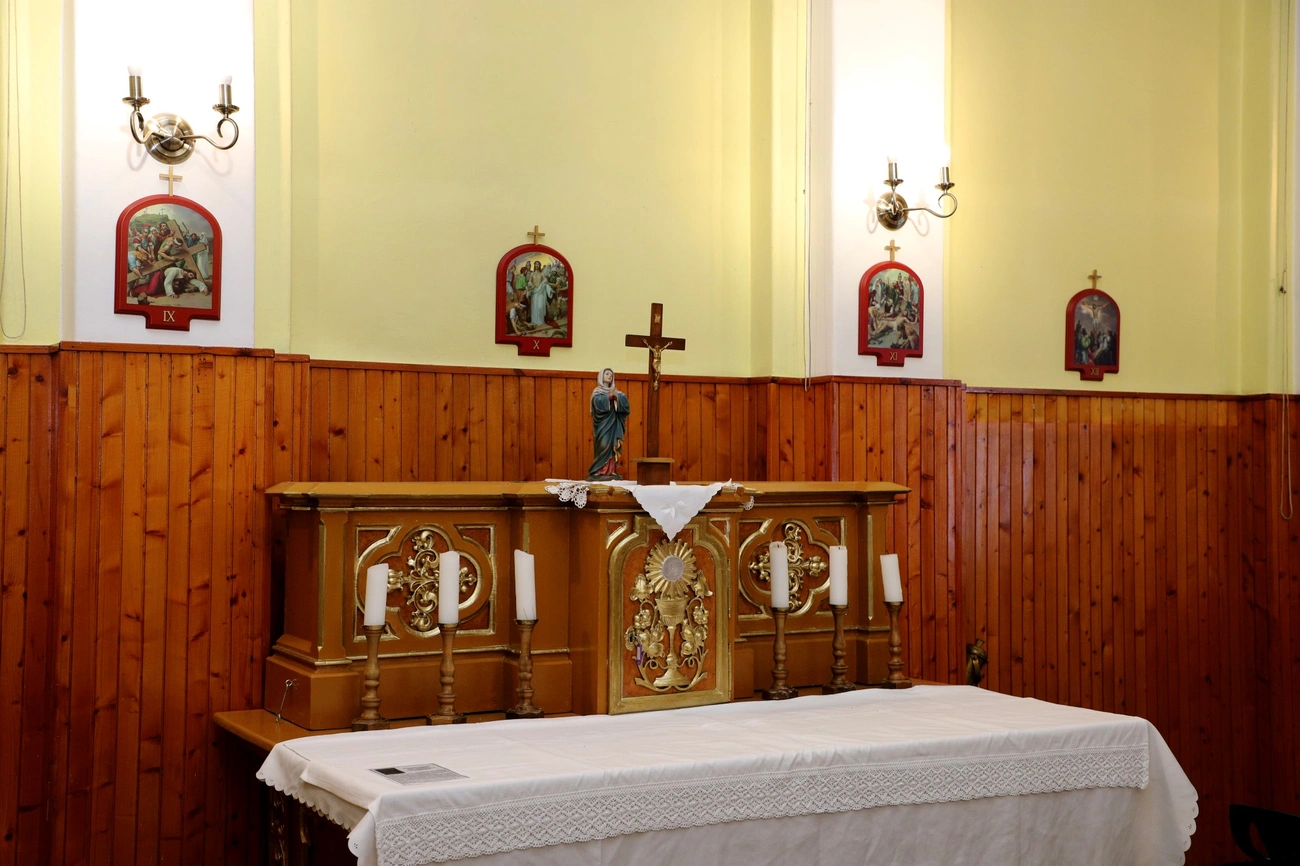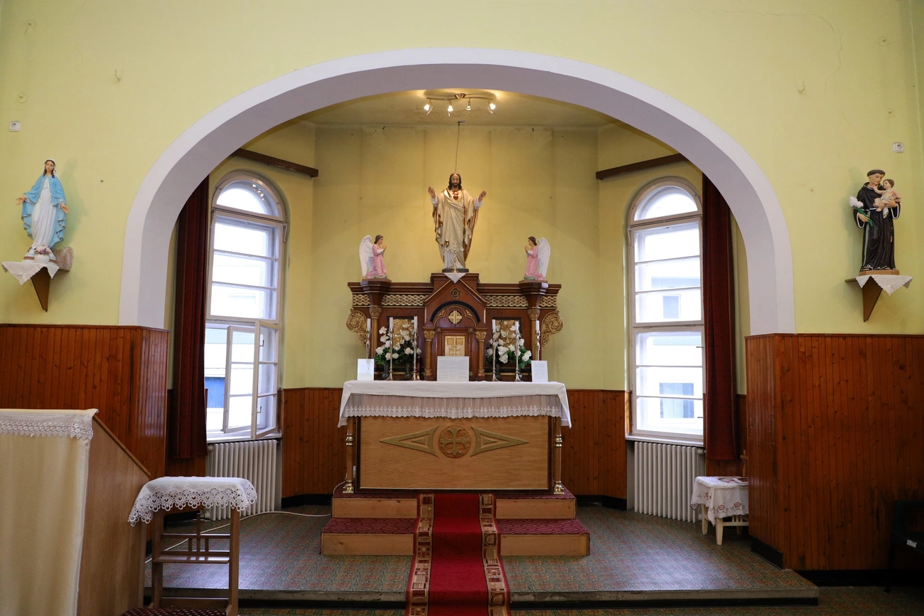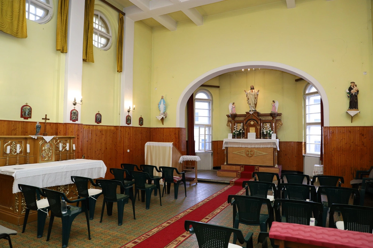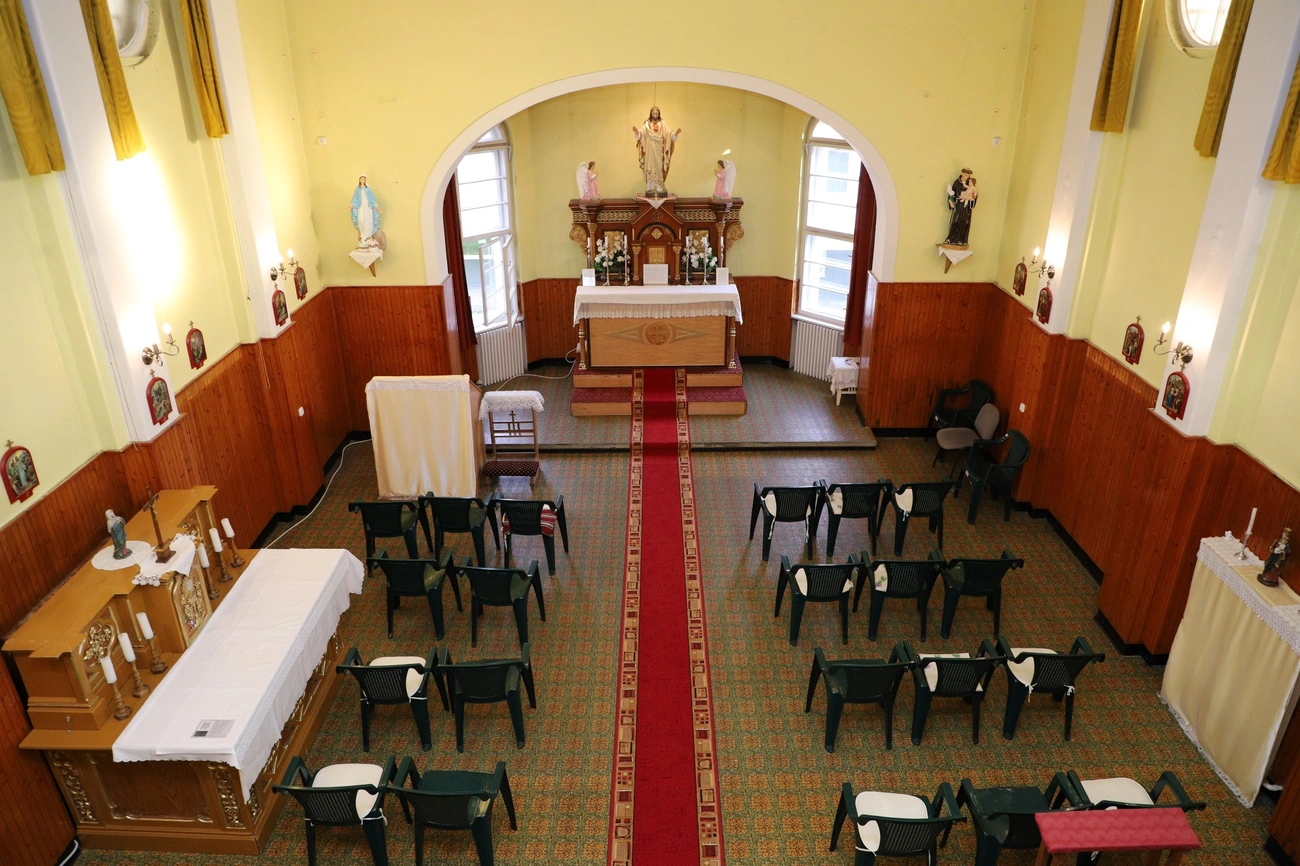 Az épület nagy része üres: nincsenek már bútorok az egykori igazgatósági szárnyban és a gazdaságiban sem, mint ahogyan a nővérek néhai lakhelye, az első emelet is üres. Kivéve a kis kápolnát, amit az elmúlt években a hívek rendeztek be újra – kezdte Bárcziné Sowa Halina.