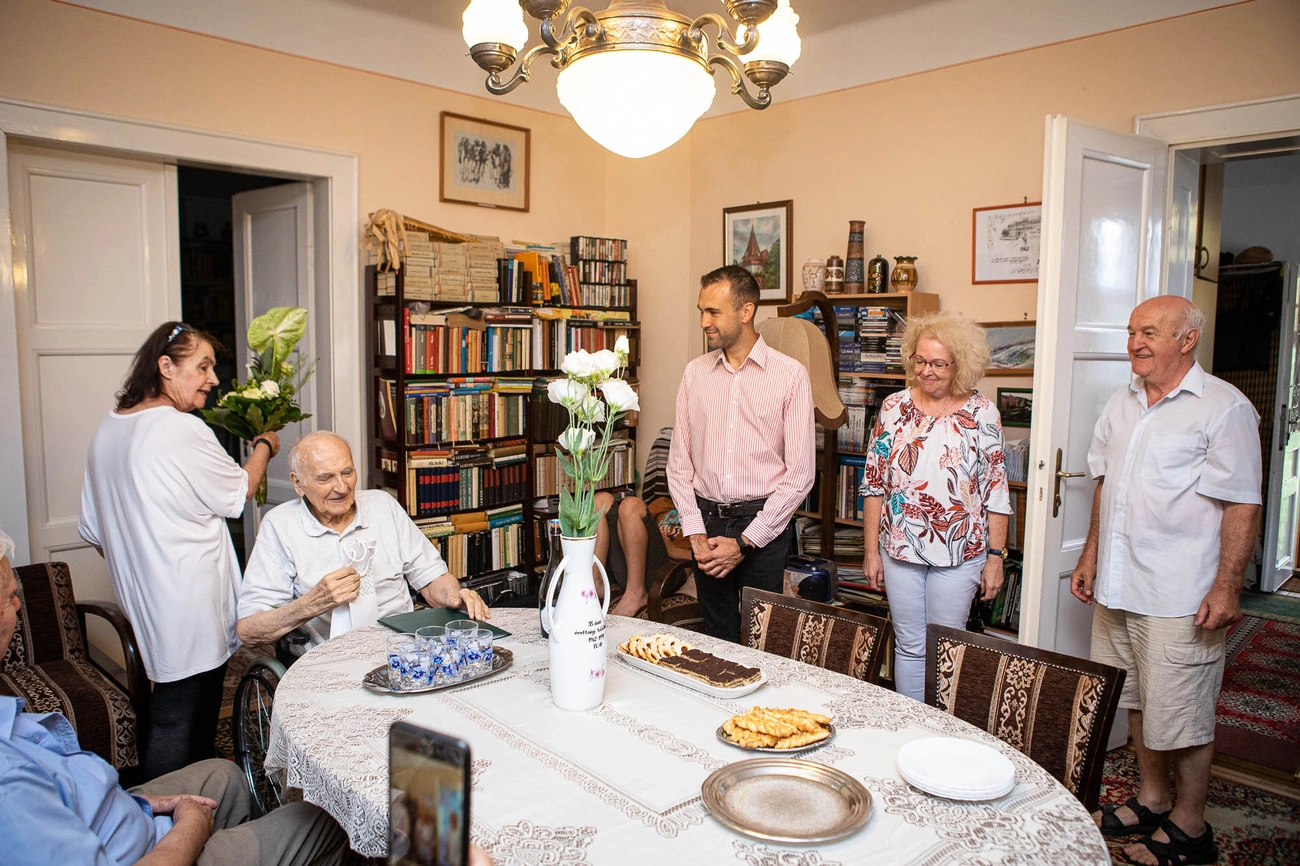 Viktor bácsi a Tiszafüredhez tartozó Tiszaörvényesen született, német ajkú családban, akik még Bécsből érkeztek Magyarországra. Négy testvér egyike volt, innen a népes család is, akik csütörtökön köszöntötték. Hozzájuk csatlakozott Bazin Levente képviselő és Szomorné Takács Tünde, a Lakosságszolgálati Főosztály csoportvezetője, hogy tolmácsolják az önkormányzat jó kívánságait.