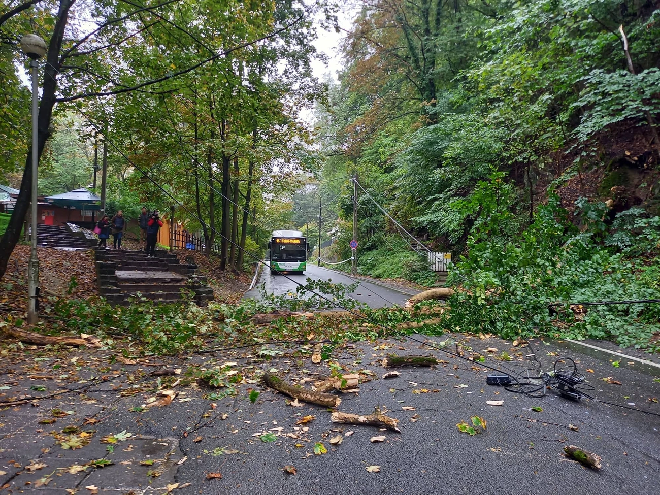 A szomszédos villanyoszlop megrogyott, a vezetéke és tartozékai leszakadtak.