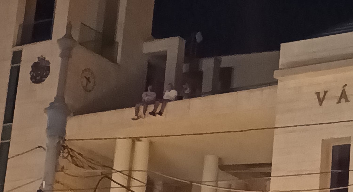 A Városháza tetőteraszán egy többfős csoport átmászott a korláton, és kiült az épület szélére.