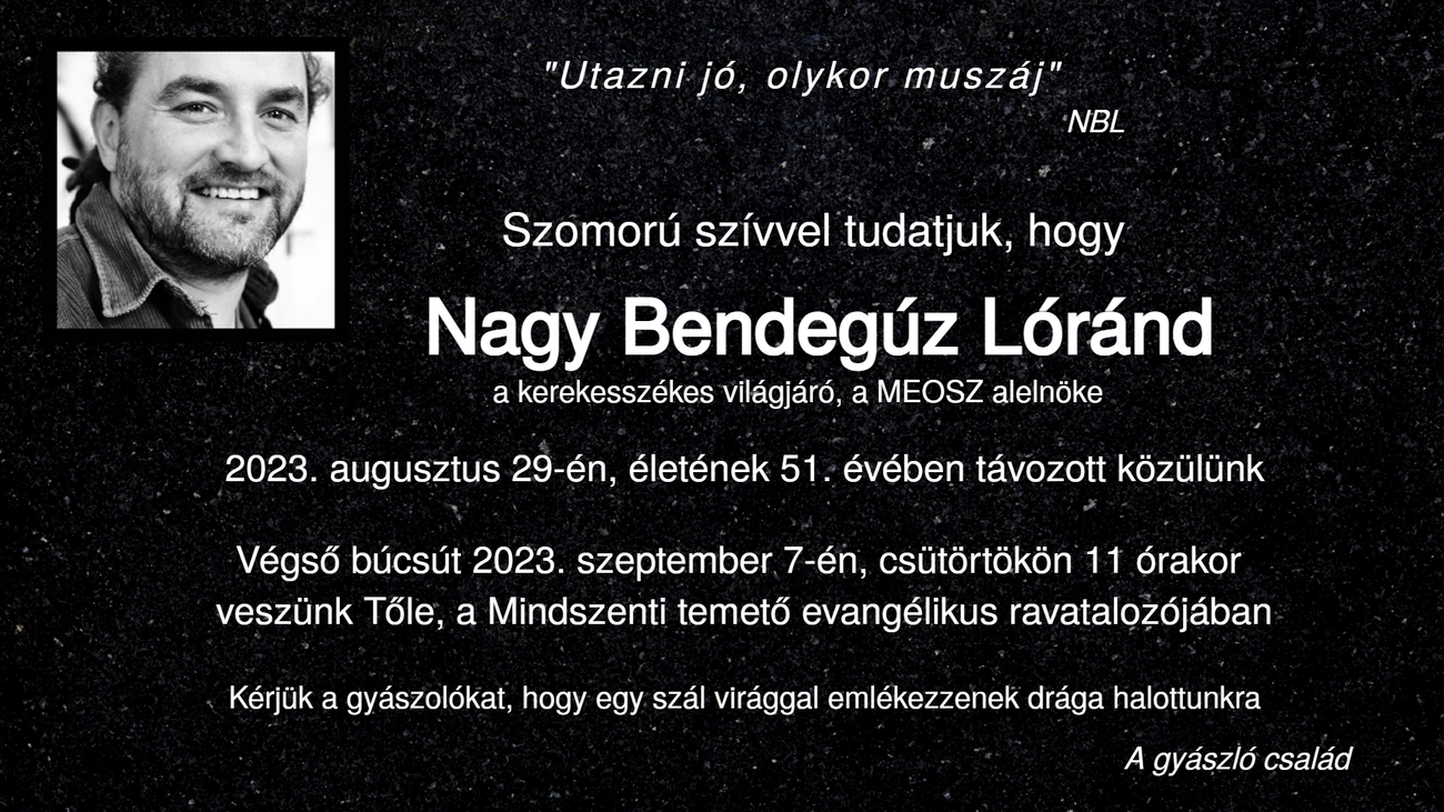 Méltósággal viselt, hosszan tartó súlyos betegséget követően 2023. augusztus 29-én, 51 évesen elhunyt Nagy Bendegúz Lóránd építész, rehabilitációs és környezettervező szak-mérnök, a kerekesszékes világjáró, Miskolc város Nívódíjas polgára, a Mozgáskorlátozottak Egyesületeinek Országos Szövetségének alelnöke.