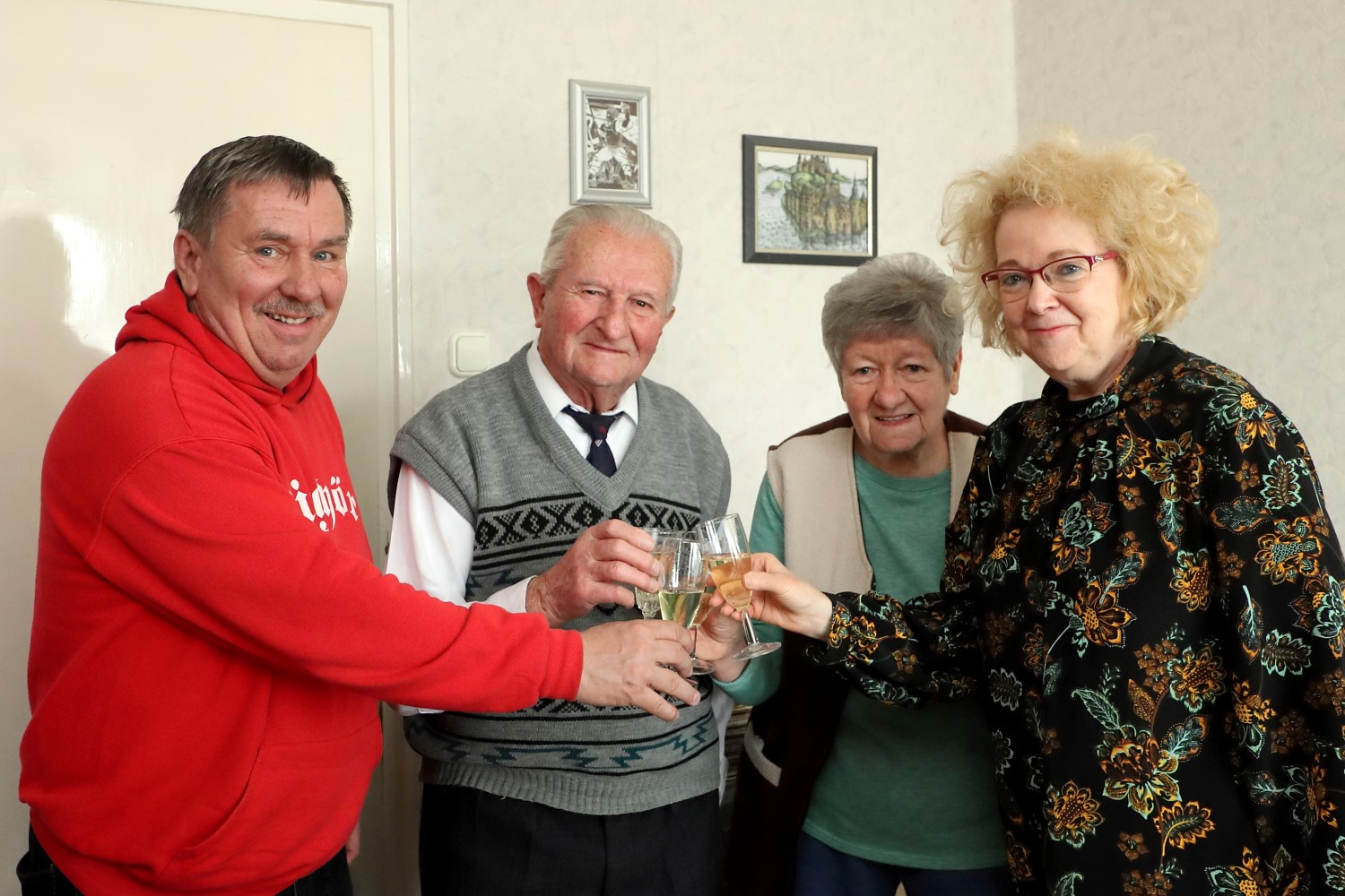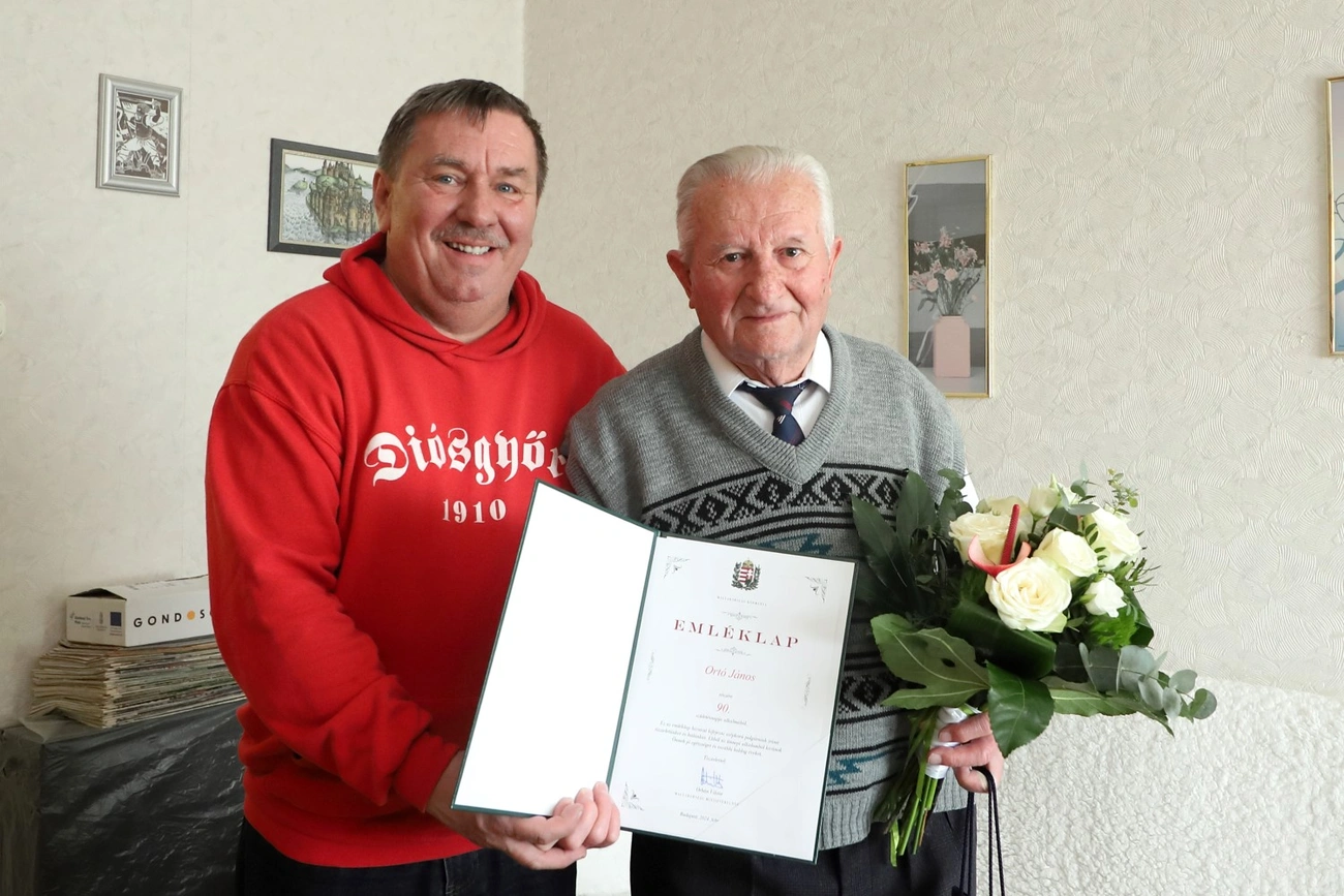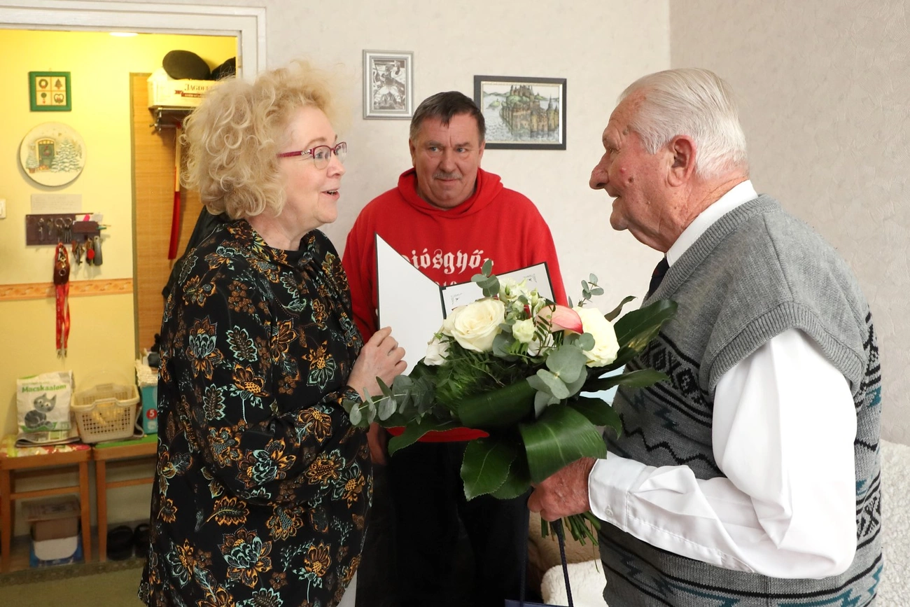János bácsi fitten, fiatalosan fogadta feleségével az őt köszöntő maroknyi csapatot, és boldogan vette át a jubileum alkalmából kapott csokor virágot, valamint az Orbán Viktor miniszterelnök aláírásával ellátott emléklapot.