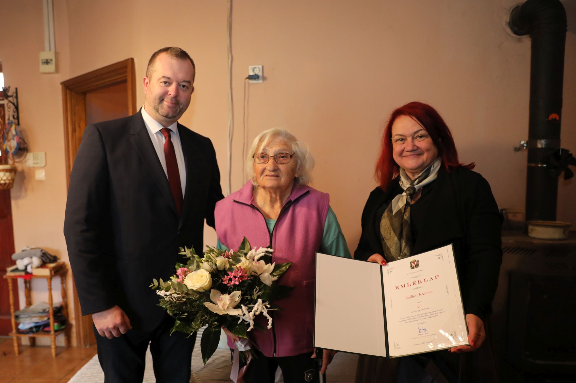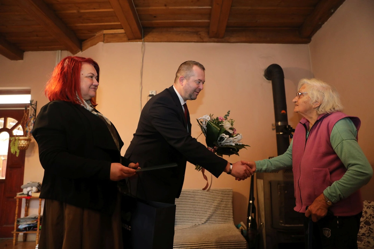 Szőllősi Istvánné, Margit nénit december 11-én, szerda délelőtt Miskolc város nevében Hollósy András alpolgármester és Kavecsánszki Erzsébet önkormányzati képviselő köszöntötte virágcsokorral, ajándékcsomaggal és egy Orbán Viktor miniszterelnök által aláírt emléklappal. Az ünnepelt unokájának feleségével fogadott bennünket Hutás utcai otthonukban.
