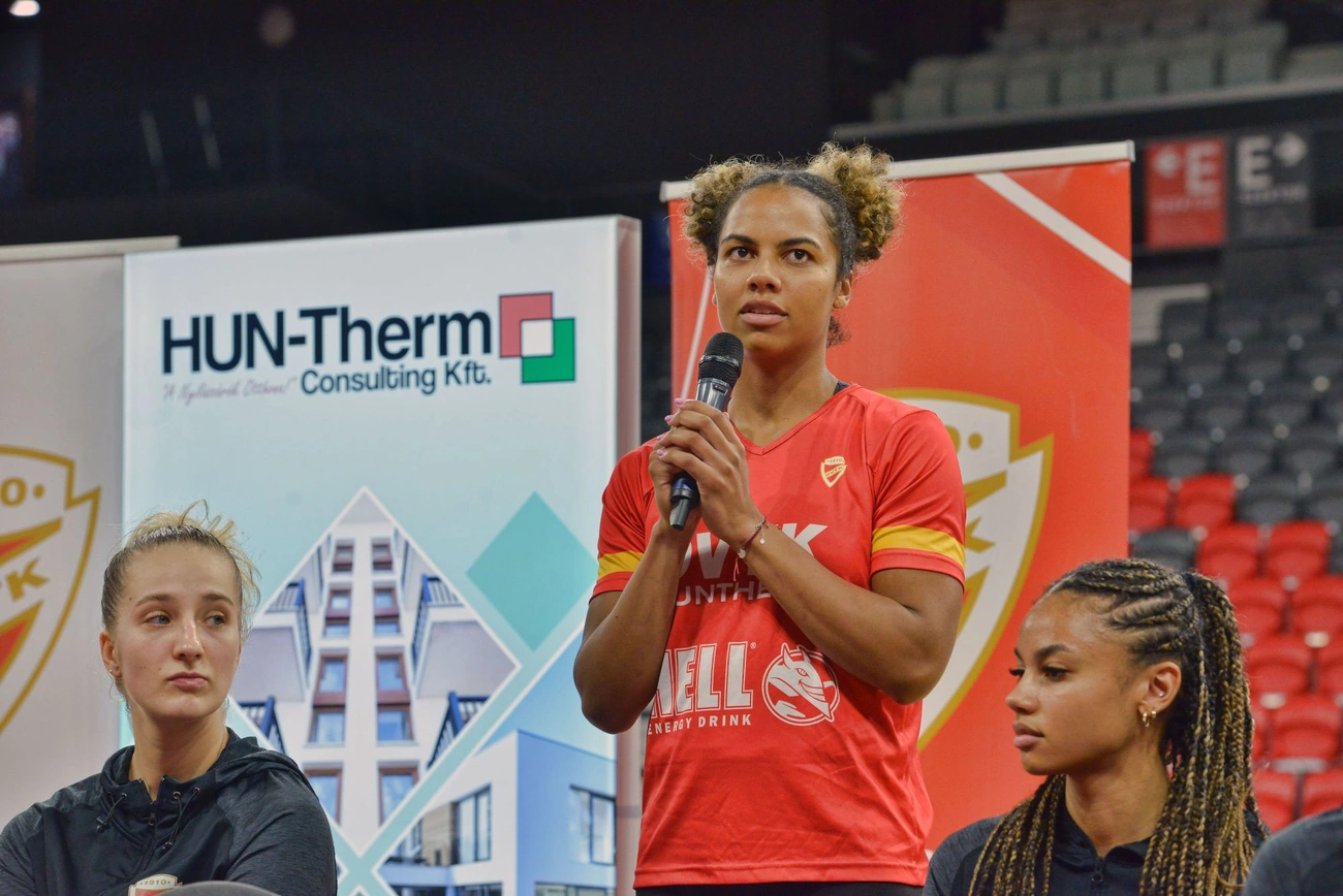 A játékosok közül elsőként Aho Nina ragadta magához a mikrofont. Ekkor derült ki, hogy a betegséggel bajlódó Kányási Veronika csapatkapitányt helyettesíti. Széles mosollyal fordult a publikumhoz: azt kérte, hogy legyenek ismét telt házas meccseik az arénában. Már feldolgozták, amit fel kellett dolgozniuk, és azt ígérte, hogy energiadús csapatjátékot produkálnak majd.
