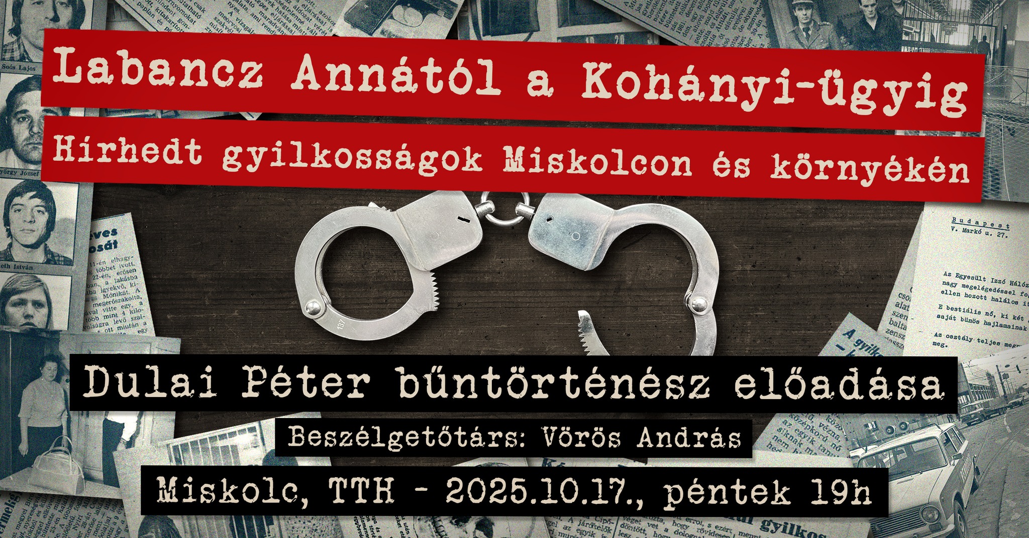 Dulai Péter bűntörténész, kriminalista tart előadást a Tudomány és Technika Házában Labancz Annától a Kohányi-ügyig - Hírhedt gyilkosságok Miskolcon címmel. Beszélgetőtárs: Vörös András, az Élet elleni bűncselekmények podcast társházigazdája lesz.