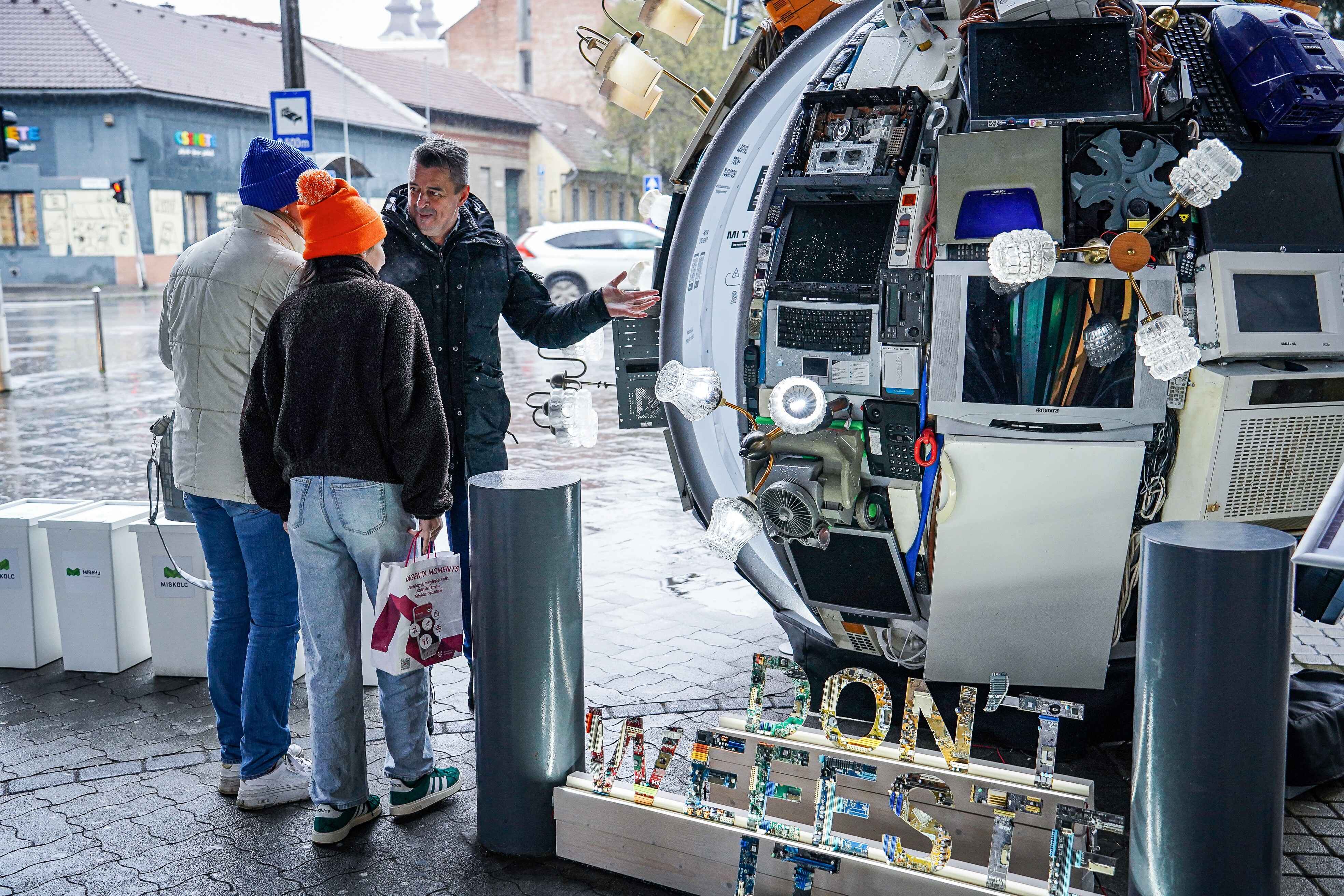Az egyik miskolci bevásárlóközpont előtt különleges, egyszemélyes kiállítótér fogadja az érdeklődőket. A társaság egy régi, gömb alakú mászókát alakított át, majd különféle elektronikai hulladékkal – lámpákkal, porszívóval, kávégéppel, televízióval – vont be, hogy látványos formában mutassa be a mindennapok során keletkező e-hulladék mennyiségét és sokféleségét.
