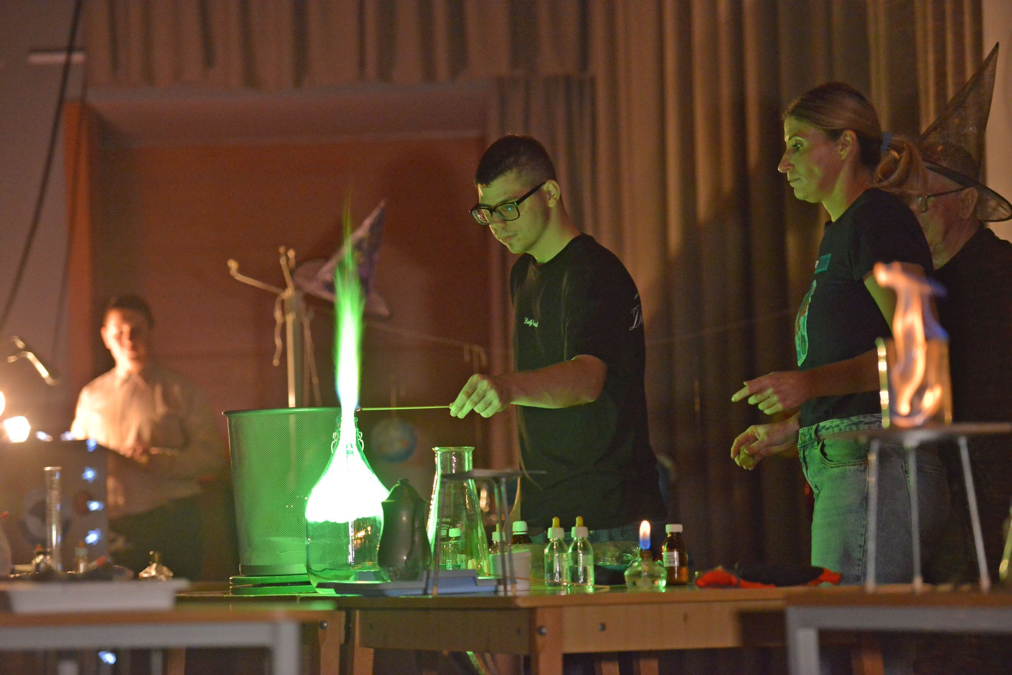 Hozzátette, a fizikai jelenségek között szerepelt a nagyfeszültségű elektromos ívet bemutató Jákob lajtorjája, míg a kémiai bemutatók között „tűzokádó sárkányok” is előkerültek éter és PET-palack segítségével.