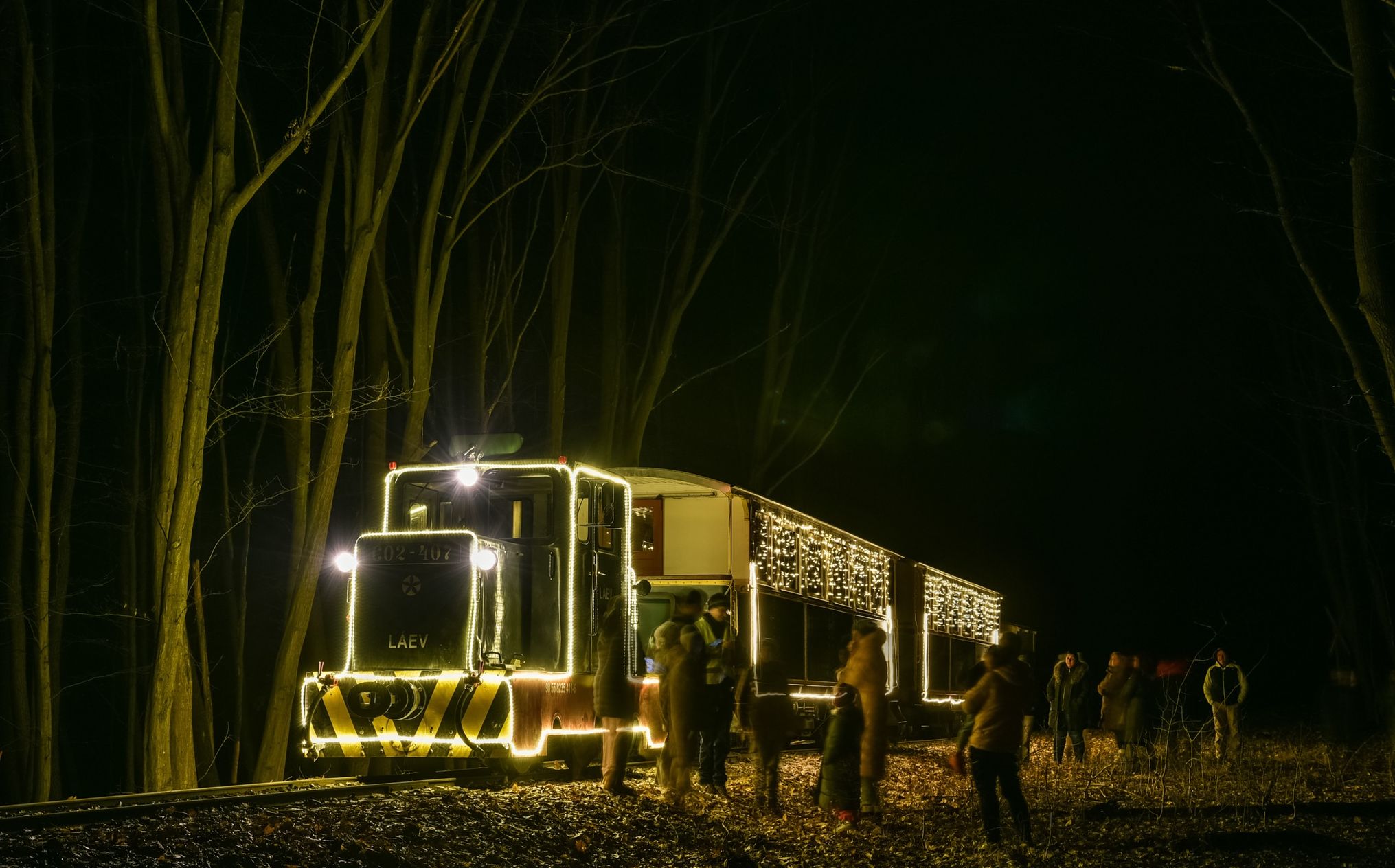 A LÁEV díszfényekkel feldíszített kisvonata január első hétvégéjén indult útnak. Szombaton 13 órakor gördült ki a Dorottya utcai végállomásról, és már az odaúton is több helyszínen megállt, hogy a résztvevők megörökíthessék a különleges szerelvényt és a téli erdő hangulatát.