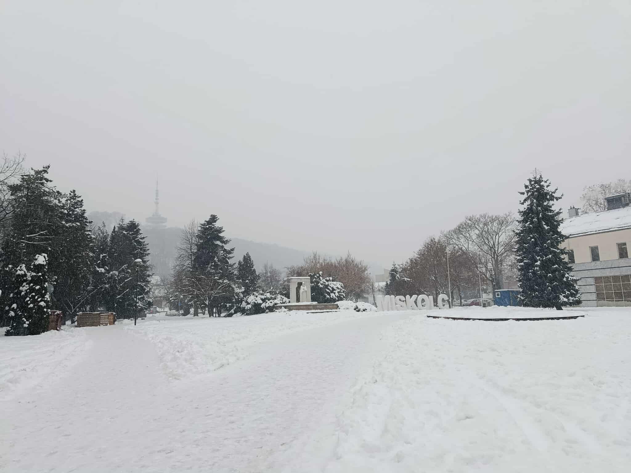 Hatalmas pelyhekben hull a hó Miskolcon január 13-án, kedd reggel is. Fehérbe öltözött a Bükk városa.