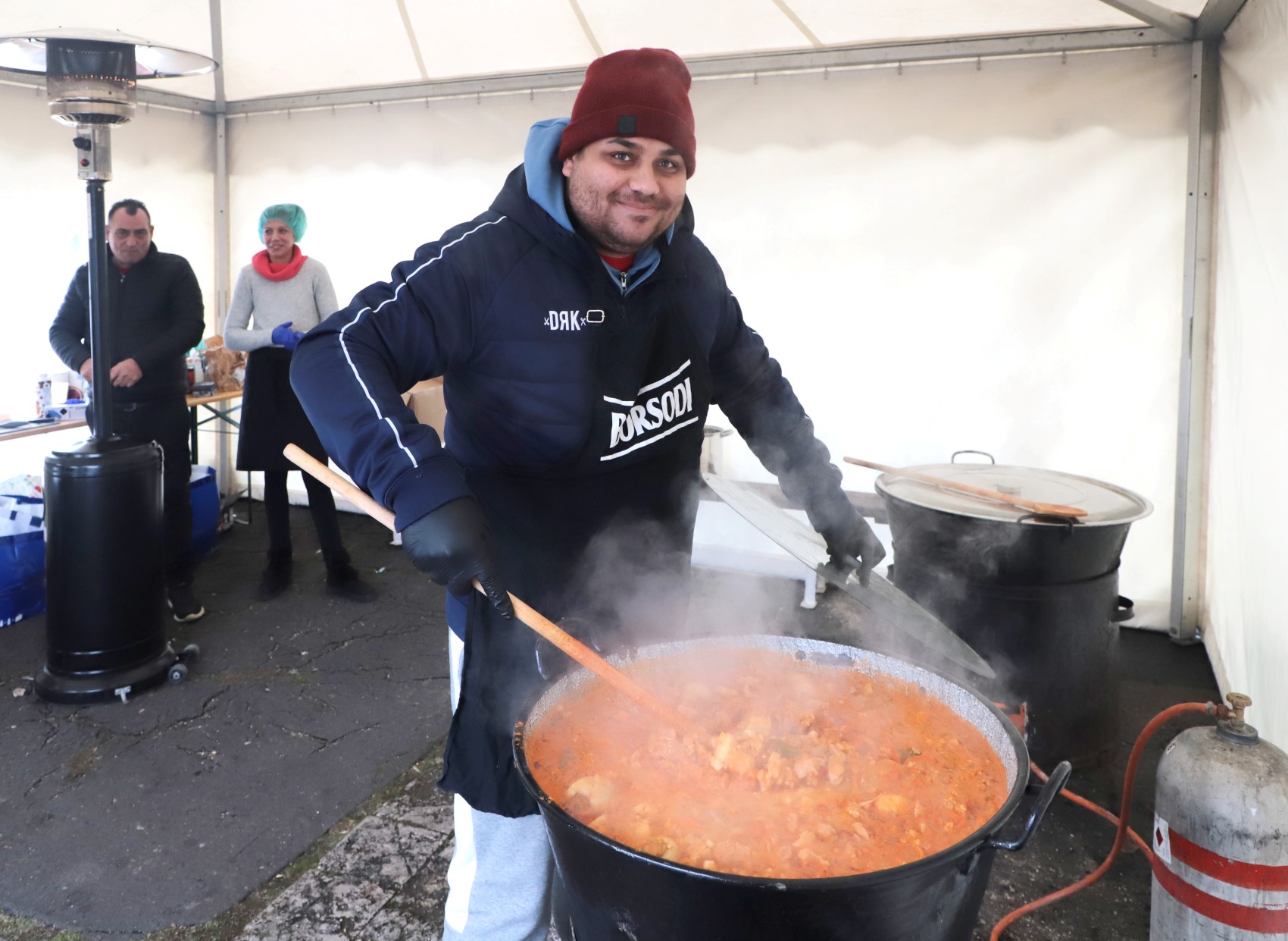 - A feleségem már reggel 7 órakor a helyszínen volt. A segítőinkkel összerakták a sátrat, amit béreltünk. Amikor fél 9-kor én is befutottam, kipakoltunk három hatalmas 350 literes üstöt. Az egyikben forró, citromos teát főztünk a járókelőknek és az Újgyőri főtéren várakozóknak. Majd előkészítettük a húst és felvágtuk a zöldségeket. Egy órakor, amikorra meghirdettük az ételosztást, mint derült égből a villámcsapás, több száz ember jelent meg – számolt be Galamb Alex pék, a Sütni Jó Alapítvány elnöke.
