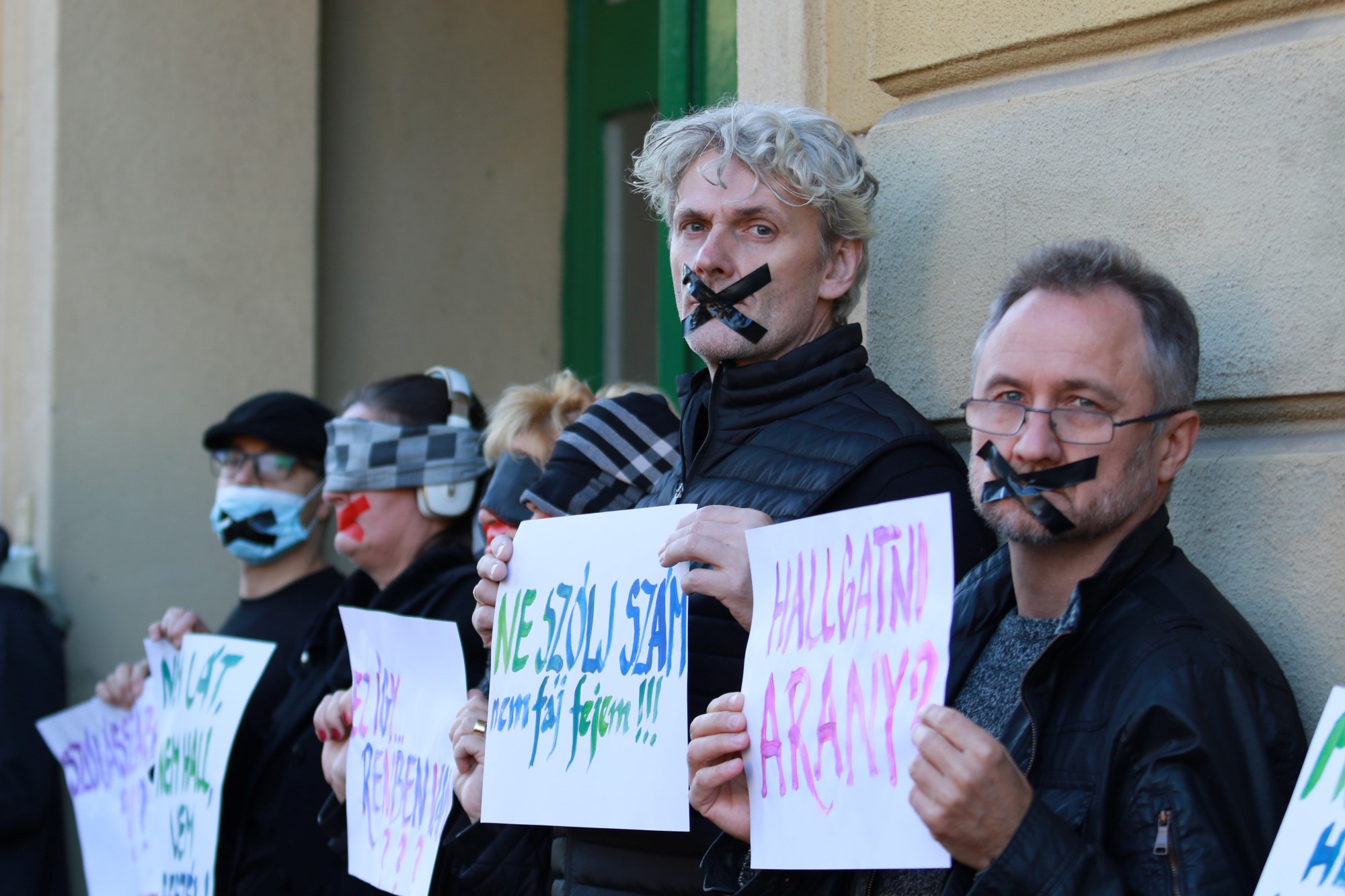 Fekete szigetelőszalaggal leragasztott száj, befogott fül, letakart szem; mint aki nem lát, nem hall, és nem beszél - az akcióban részt vevő pedagógusok szerint ilyennek szeretné látni az oktatási vezetés és a magyar kormány a tanárokat. Közel negyven tanár sorakozott fel csendben szerda reggel 7:45-kor a miskolci gimnázium előtt. Nem volt hangosbeszélő, vezérszónok se állt a pedagógusok élére - egyszerűen kiálltak, és némaságukkal tiltakoztak a tanítás 8 órai megkezdéséig.