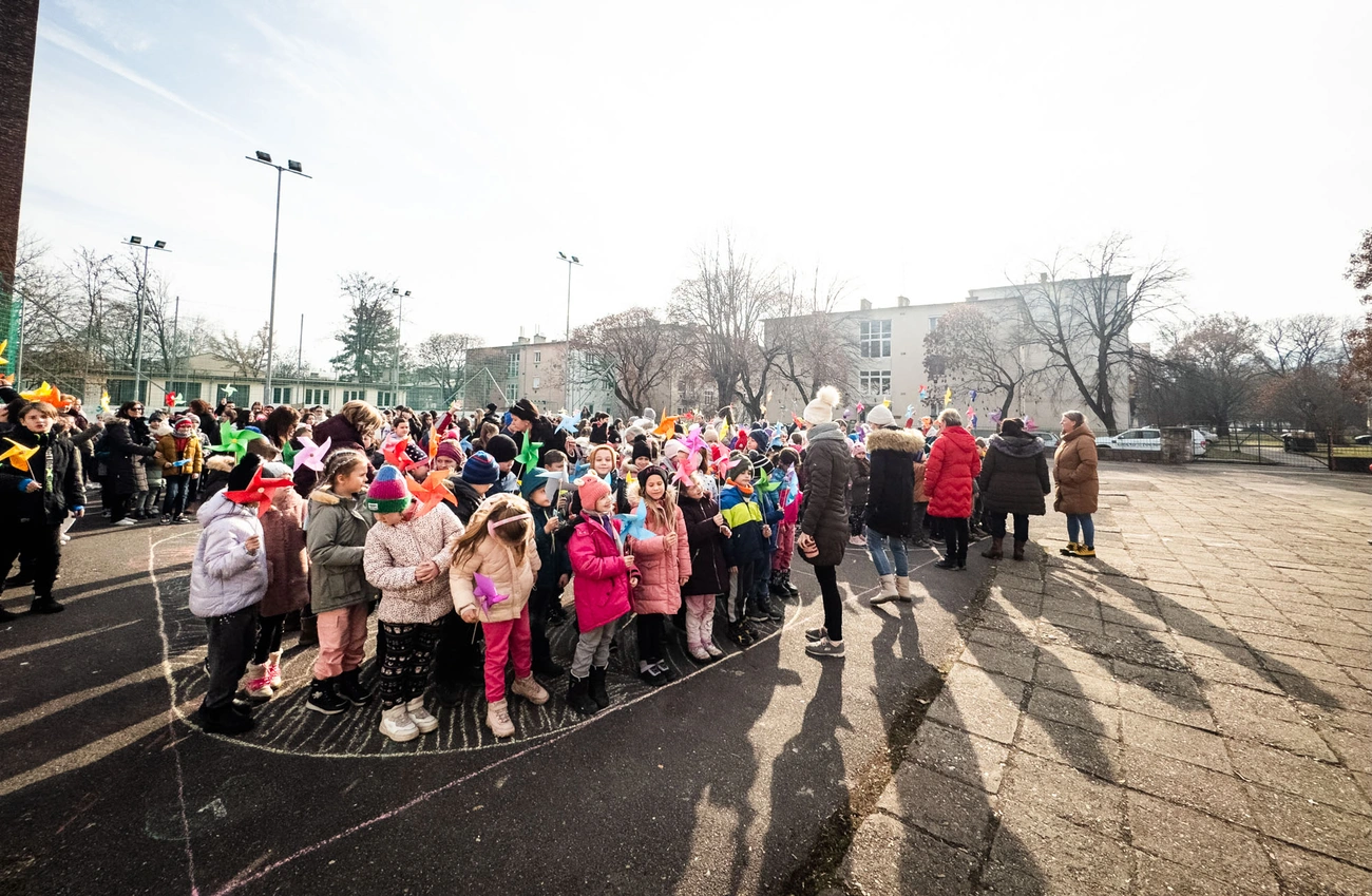 A Kaffka Margit Általános és Alapfokú Művészeti Tagiskola idén ünnepli fennállásának 65. évfordulóját. Ebből az alkalomból látványos flashmobot adtak elő február 12-én, szerdán délelőtt. Valamennyi tanulójuk összeállt egy fényképre és a hatvanötös számot formálták meg. Minden diák egy színes szélforgót fogott a kezében, amelyekre jó kívánságokat írtak és ezeket „elvitte a szél.” Először az arcuk előtt tartották, majd pedig az ég felé emelték papírból készített szélforgóikat.